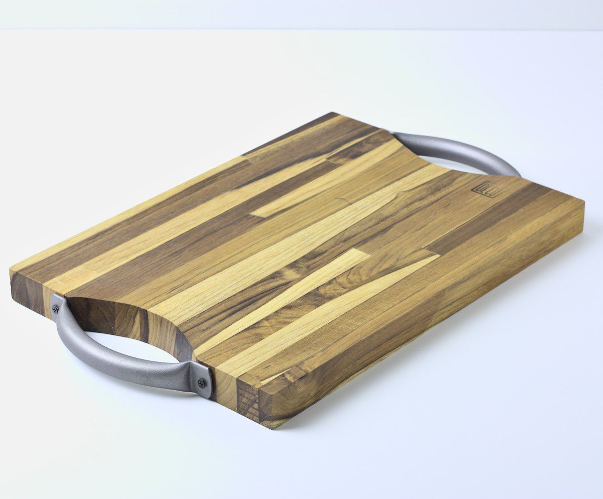 A tábua Madrid é feita com madeira machetada, que proporciona um lindo padrão visual. Suas alças em metal facilitam o manuseio, tornando-a perfeita para montar uma bela tábua de frios ou servir um delicioso churrasco.